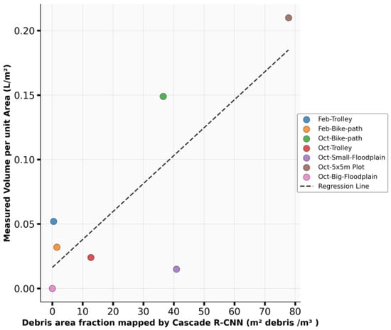 The volume of debris per unit area (L/m2) derived from the ground reference plots showed a positive correlation with the area of debris predicted by the Cascade R-CNN model from the UAV imagery (p = 0.03, r = 0.8, Figure 3). This relationship confirms that the spatial extent of detected debris in orthomosaics can serve as a reliable proxy for estimating debris volume on the ground. Discrepancies were observed in certain plots, such as the Small Floodplain, where large but fewer items led to higher ground-measured volume despite moderate mapped area. The outlier reflects differences in debris size distribution and material type (Figure S1).
