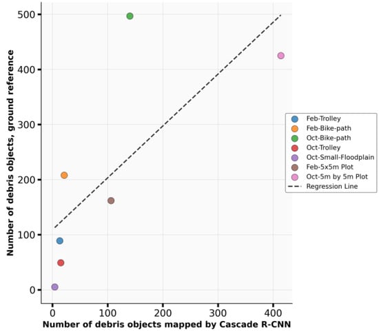 Comparison of plastic debris quantities detected by the Cascade R-CNN model and those recorded during ground reference surveys across multiple validation plots. The x-axis represents the number of plastic items detected in UAV imagery by the model, and the y-axis represents the number of plastic items manually counted in the field within corresponding 5 × 5 m plots. Each point corresponds to a specific plot, color-coded by location and survey date (e.g., Feb-Trolley = February 2022 trolley plot). The dashed black line shows the regression line (r = 0.74, p = 0.06).