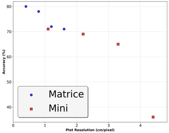 Impact of image resolution on detection accuracy for two sensor platforms (Matrice and Mini). Detection accuracy declined sharply at resolutions coarser than 3.3 cm/pixel, underscoring the importance of sub-centimeter spatial resolution for reliable debris identification. The pattern was consistent across platforms, highlighting resolution as the dominant factor over sensor type.