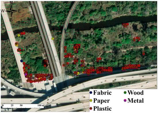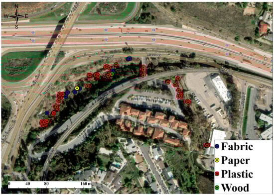 Spatial distribution and classification of anthropogenic debris across survey sites and time periods based on UAV image analysis. Mission Valley Preserve—February 2022. Detected debris types are color-coded by material, illustrating temporal variation in density and spatial clustering.