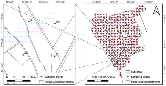 The first study area of the project was selected to be the Dudles Forest, located north of Sopron, in Western Hungary. This forest spans 1067 hectares and is predominantly composed of Turkey oak (Quercus cerris), sessile oak (Quercus petraea), and Scots pine (Pinus sylvestris), as well as black pine (Pinus nigra). Previously, a total of 272 permanent sampling plots were established across the forest using a 200 × 200 m grid system, with minor deviations in certain locations [1,2].