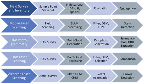 At these four sample locations, five distinct methods were used to determine dendrometric parameters, including stem position, diameter at breast height (DBH), and tree height. The software applied for the estimation of these parameters—introduced in the following sections and developed with our contribution—incorporates procedures for calculating dry biomass and carbon stock. A detailed description of these calculations is provided in [2]. Among these methods, two are terrestrial-based, while three are aerial, including two drone-based techniques and one light aircraft-based approach. The procedural steps of each method are illustrated in Figure 2.