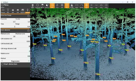 Tree detection and dendrometric parameter extraction from the generated point cloud were carried out using the dotXpert v1.25.5.6 software (TopoLynx Ltd., Kőszeg, Hungary) (Figure 3). The processing workflow includes the filtering of outlier points, generation of the DTM via hierarchical ground point filtering (upward) and interpolation (downward), and filtering and segmentation of points between 1.1 and 1.5 m, followed by three types of fitting to the segmented clusters: regression circle, regression cylinder, and RANSAC circle. The best-fitting model is then selected, and the results are exported. Numerous parameters can be configured in the software for each processing phase, including ground filtering options, DTM resolution, height range for trunk detection, segment size, noise filtering, DBH range, fitting method, and fitting threshold.