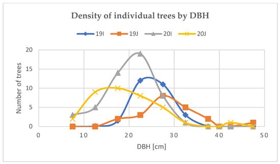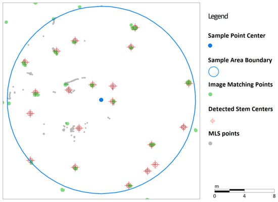 The results of the ground survey serve as a reference for evaluating the other methods. The results consist of a data set for each test plot, containing the diameter, height, and species of each tree. The average and total values obtained by aggregating the data are presented in Table 1, while Figure 5 shows a DBH-based density chart for each sampling point. It is important to emphasize that in our case, the measurement of the distance from the center and the angle with the northern direction used to determine the trunk positions was not performed with geodetic-grade equipment but was estimated, with an accuracy of a few meters. Therefore, some deviations may be observed, but despite this, the individual trees can be paired with the results of the remote sensing methods. This is illustrated in Figure 6, where we compare these positions with those recorded by the MLS.