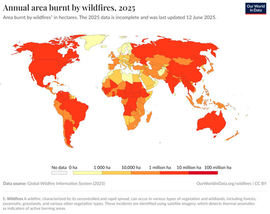 - Global Wildfire Information System (2025)—With Minor Processing by Our World in Data. Available online: https://ourworldindata.org/grapher/annual-area-burnt-by-wildfires?tab=maps (accessed on 22 June 2025).