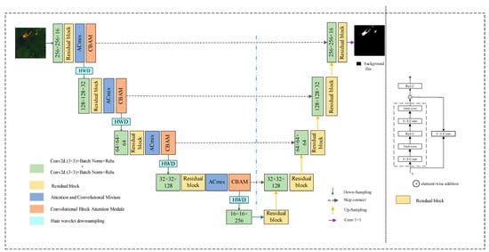 FDE U-Net acts as an end-to-end encoder–decoder network, with the encoder portion receiving the input image and the number of channels extended to 16, enabling the network to extract richer feature information from the input data, which helps to capture spatial and spectral features in multi-band images. The encoder uses four residual blocks, which effectively mitigates the gradient-vanishing problem in deep network training, improving the model’s ability to extract deep features. The ACmix and CBAM are integrated into each downsampling layer. The ACmix module adaptively blends cross-channel features between multispectral bands by combining convolution and self-attention operations to promote effective interaction and fusion of features between different channels. This enables the model to effectively integrate the differentiated spectral characteristics between different bands, enriches the feature expression, and improves the model’s ability to understand complex image content. To further improve the model’s performance, CBAM refines the weighting of feature maps in two dimensions, space and channel, such that the model can focus on key areas in the image. CBAM can adjust its focus based on the response characteristics of different bands. For example, in the thermal infrared band, it enhances the fire area, reduces background noise, and effectively separates the fire. In the spatial dimension, it focuses on the fire’s morphology and boundaries, thereby improving segmentation accuracy. Regarding the downsampling strategy, the traditional maximum pooling operation is abandoned, and HWD is adopted. The HWD utilizes the multiscale analysis capability of the wavelet transform and reduces the resolution of feature maps through the Haar wavelet transform. While reducing the resolution, the fire edges, texture details, and cross-band contextual association information in the multispectral image are retained, which retains more image detail information and provides richer contextual information for subsequent segmentation tasks.
