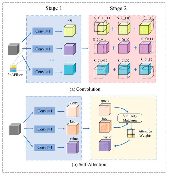 Convolution and self-attention are two powerful representation-learning techniques. For a standard convolution operation, Figure 3a shows a 3 × 3 convolution decomposed into nine 1 × 1 convolutions, followed by shift summation [43]. First, a linear projection of the input feature map is performed using the kernel weights at a specific location; the projected feature map is then shifted and aggregated based on the position. For the self-attention operation, as shown in Figure 3b, the input features are first projected into queries, keys, and values using a 1 × 1 convolution, after which the attention weights are computed and the values are aggregated. As shown in the figure, the first step of both operations includes a 1 × 1 convolution. ACmix combines the advantages of convolution and self-attention to achieve the dual functions of the deep extraction of spatial features and efficient aggregation of global information.