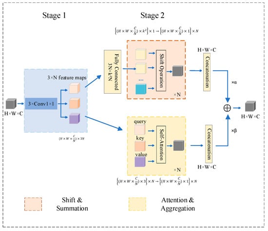 The second step is to reuse and aggregate the intermediate features in different modes (self-attention and convolution). When obtaining the self-attention feature, the intermediate feature set is divided into N groups. Each group contains three feature maps, and the three feature maps are used as query, key, and value matrices to obtain the self-attention feature . In obtaining the convolution features, assuming that the convolution kernel size is k, a fully connected layer is used to obtain k2 feature maps, and the convolution feature is calculated and summed. To eliminate the inefficiency of tensor shift operations, we employ depthwise convolutions with fixed kernels as a lightweight and effective alternative. If we denote the convolution kernel (kernel size k = 3) as