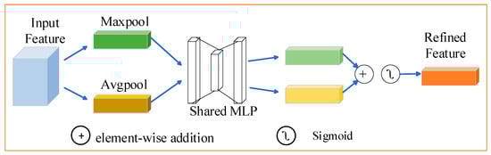 Figure 6 shows the details of the channel attention implementation. Input feature map F is compressed in spatial dimension by global average pooling (GAP) and global maximum pooling (GMP) operations to obtain one-dimensional vectors and , corresponding to the feature representations obtained through average and maximum pooling, respectively. The output sizes of the GAP and GMP are 1 × 1 × C. They are then fed into a shared multilayer perceptron (MLP), comprising two fully connected layers, producing outputs denoted as and . The outputs of the GAP and GMP after the MLP are summed element-by-element to obtain the channel attention weight map . The original input feature map F is multiplied by the channel attention weight map to adjust the weight of each channel. The channel attention mechanism can selectively enhance the important feature channels and suppress irrelevant or redundant channels by calculating the importance weight of each channel. The computation of channel attention is defined as follows: