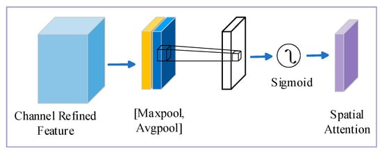 The implementation details of spatial attention are shown in Figure 7. It mainly calculates the importance weight of each position to perform weighted adjustment on the input feature map and highlight the key spatial features. The feature map produced by the channel attention mechanism is first utilized as the input feature representation for this module. Global average pooling (GAP) and global maximum pooling (GMP) are performed on the input feature map, and pooling is performed along the channel dimension, respectively, to obtain two single-channel feature maps and . The output sizes of GAP and GMP are both H × W × 1. Then the single-channel feature maps generated by GAP and GMP are concatenated in the channel dimension to obtain a feature map of size H × W × 2. Finally, a 7 × 7 convolutional layer is applied to the concatenated feature map to produce the spatial attention weight map . The original input feature map F is multiplied by the spatial attention weight map to perform a weighted adjustment on each position. Spatial attention is calculated as follows: