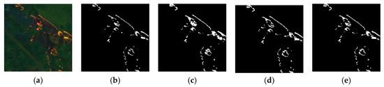 A significant category imbalance is observed between the fire and non-fire pixels in the dataset. We select image patches with a high and low proportion of fire pixels to detect small fire regions. A total of 1100 image blocks are selected from the huge LAFD dataset, and these data are horizontally and vertically flipped, ultimately generating 3300 image blocks to enhance the diversity of the dataset. The dataset was divided with 80% used for the training and validation processes and 20% reserved for testing to ensure the independence and effectiveness of the model evaluation. Our dataset refers to the three algorithms discussed in [39,40,41]. We use a “three-round, two-win” voting scheme (if at least two sets of conditions agree that it was a fire pixel, it is considered a fire) to generate the dataset. In Figure 9, (a) shows one of the fire scenes; (b), (c), and (d) represent the masks generated by the three algorithms; and (e) represents the voting result. The three algorithms are as follows: