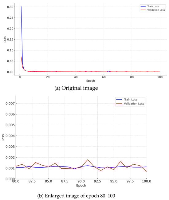 Figure 10 shows the loss curve of the proposed architecture. It can be seen that the loss curve decreases and eventually stabilizes. Early stopping was applied to prevent overfitting, and the training was stopped when the validation loss did not improve within five epochs. The batch size used during training was set to 32 to balance the memory capacity and training speed.