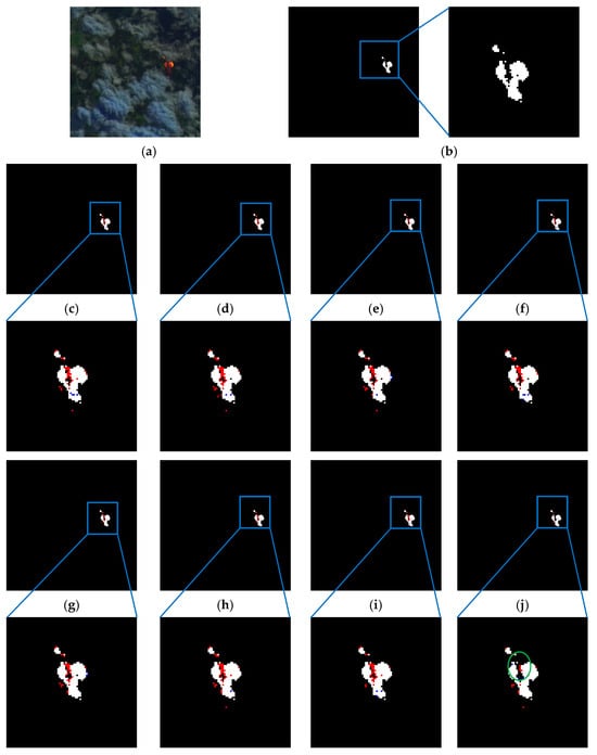 (a) Original image. (b) Ground truth. (c) ResU-Net. (d) Improvement 1. (e) Improvement 2. (f) Improvement 3. (g) Improvement 4. (h) Improvement 5. (i) Improvement 6. (j) FDE U-Net.