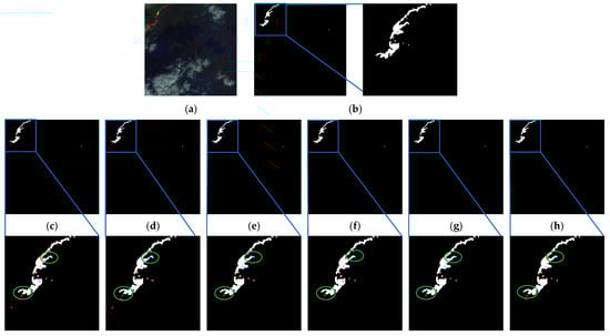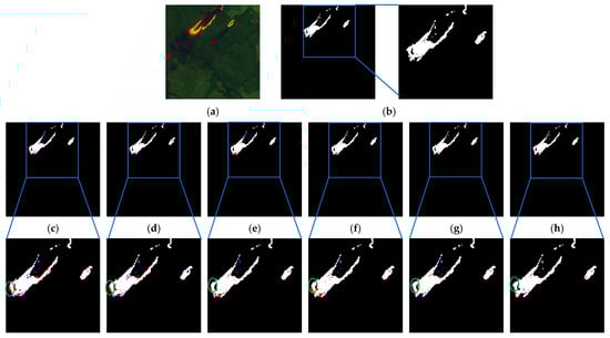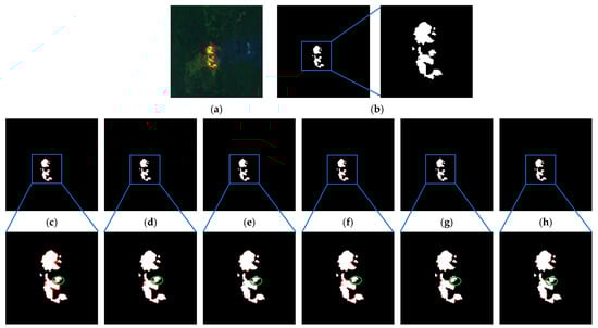 As shown in Figure 13 and Figure 14, the fire areas in the two scenarios are more concentrated, and most of the models are able to accurately find the exact location of the fire, the significant difference in the outputs is that the edges of the fire areas are not clearly segmented, such as in the elliptical box area in the figure, with more false positives as well as a small number of missed detections. The proposed method overcomes this problem by enhancing feature extraction, feature fusion, and detail processing. As shown in Figure 14c–g, this scene shows that there are many clouds in the image, and the fire area is relatively small. The high brightness of clouds easily confuses the fire area with the background area. The classic segmentation models U-Net, ResU-Net, U-Net3+, SwinU-Net, and WET-UNet generate a significant number of false positives, which are concentrated in the elliptical region in the lower-left corner of the fire area. As shown in Figure 14h, the numbers of false positives and false negatives are 25 and 4, respectively, which are the lowest among the compared methods. The area within the elliptical shows that the FDE U-Net performs the best boundary preservation for fire. Thus, the proposed method extracts rich, high-level semantic features and preserves the main information, which improves the network’s detection ability in the case of a category imbalance. Irrelevant information and noise are suppressed so that the model can effectively distinguish between fire boundaries and background pixels in cloudy scenes.