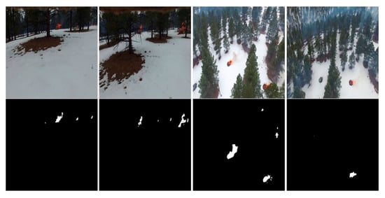 In order to further verify the role of the model in small target detection, we construct a dataset containing only small flame areas. We select 100 images with only small fires and apply horizontal and vertical flipping to generate a total of 300 small-fire images, several examples of which are shown in Figure 18. The experimental results show that the overall performance of the model decreases compared to the large-scale dataset. However, despite the overall more difficult task, FDE U-Net still performs better than other comparison models in this scenario, with an IoU of 87.89% and an F1 score of 93.49%, as shown in Table 5, maintaining its leading performance in small target recognition. This result indirectly proves that the edge detail preservation mechanism provided by the HWD module plays a key role in small-scale flame detection.