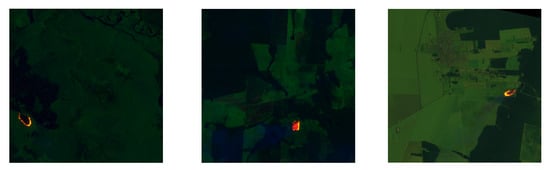 Pereira et al. released a new large multispectral dataset called LAFD in 2021 [40]. This dataset was extracted from the Landsat-8 satellite launched by NASA and included wildfires that occurred at various locations worldwide between August and September 2020. The samples covered various areas, including deserts, rainforests, farmlands, water, snow, clouds, cities, and mountains. All image blocks in the dataset were 256 × 256 pixels. These image blocks were 10-band, 16-bit TIFF images. The 10 bands included the coastal band (COASTAL/AEROSOL), three RGB bands, near-infrared (NIR), shortwave infrared (SWIR 1 and SWIR 2), cirrus band (Cirrus), and thermal infrared band (TIR1 and TIR2). The channels were b1–b11, excluding b8 (panchromatic channel), with a spatial resolution of 30 m.