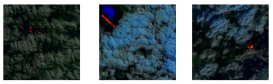 Cloud cover also has an interfering effect on remote sensing fire detection tasks. Clouds block the spectral and thermal radiation characteristics of the fire source area, while introducing a large amount of invalid background information and destroying the edge clarity of the image, thus reducing the model’s discrimination ability. To evaluate the robustness of each model under complex weather interference, we construct a dataset containing cloud-occluded scenes by increasing the proportion of cloud-containing images to 70%, several examples of which are shown in Figure 19. Table 6 shows the detection results on this dataset.