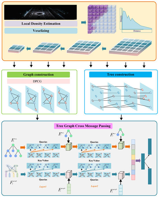 Architecture of the proposed DA-TGCMP framework for LiDAR-based 3D object detection. The framework comprises four stages: (1) density-aware voxelization, where local point densities are estimated to reflect spatial variation; (2) graph construction using the proposed DPCG strategy to build robust local neighborhoods; (3) hierarchical tree construction via structured downsampling to capture multi-scale semantic context; and (4) tree–graph cross-message passing, which enables bi-directional feature interaction between tree and graph representations for enhanced feature learning.