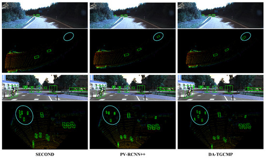 We compare voxel-based SECOND, point-voxel fusion PV-RCNN++, and our DA-TGCMP on highway and urban scenes, as shown in the Figure 5. In highway scenes, SECOND struggles with distant small vehicles, showing missed detections and inaccurate boxes. PV-RCNN++ improves this slightly, but localization remains suboptimal. DA-TGCMP delivers the precise and complete detection of small distant objects, benefiting from the tree–graph cross-message passing that enhances features in sparse regions. In urban scenes, SECOND misses many small objects (e.g., cyclists, pedestrians). PV-RCNN++ detects more objects but suffers from overlap and inaccuracy. DA-TGCMP achieves the accurate and comprehensive detection of small objects by effectively capturing fine-grained features and context. These results highlight that DA-TGCMP significantly improves small-object detection without sacrificing large-object performance.