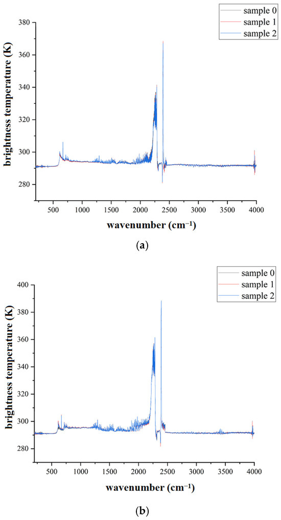 Figure 4. In the spectral diagrams, the curve trends reflect the changes in brightness temperature of different types of substances at various wave numbers. From the overall trend of the spectral curves, in the vast majority of wave number intervals, the brightness temperature curves of the hot jets of the two types of aero-engines are almost overlapping, indicating that their radiation characteristics at these frequencies are highly similar. This means that in most wavelength ranges, the material composition, content ratio, and physical and chemical states of the hot jets of the two types of aero-engines are similar, resulting in a consistent interaction with electromagnetic radiation. For example, in the low wave number region (such as 500–1500 cm