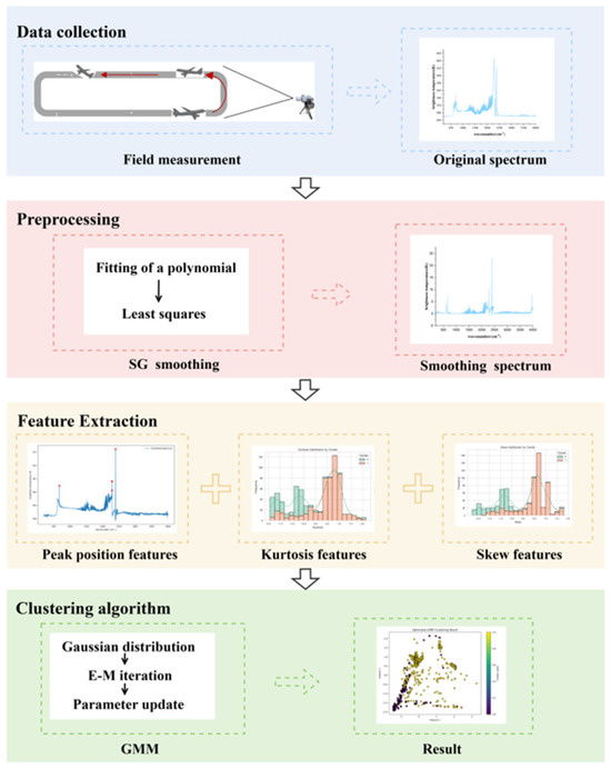 Figure 3. The experiment is mainly divided into four parts: collection of hot jet spectral data of the aero-engine, data preprocessing, construction of multi-dimensional features, and clustering.