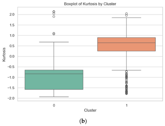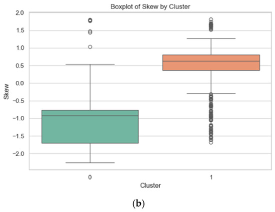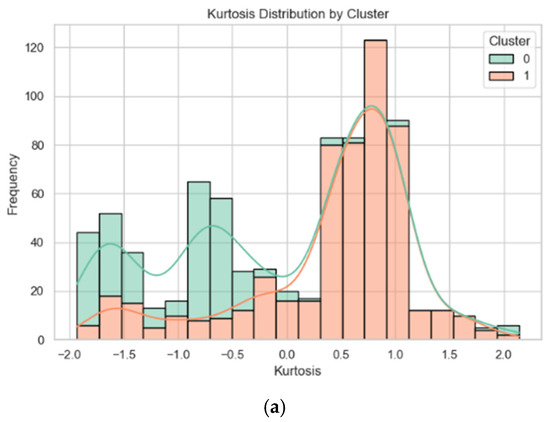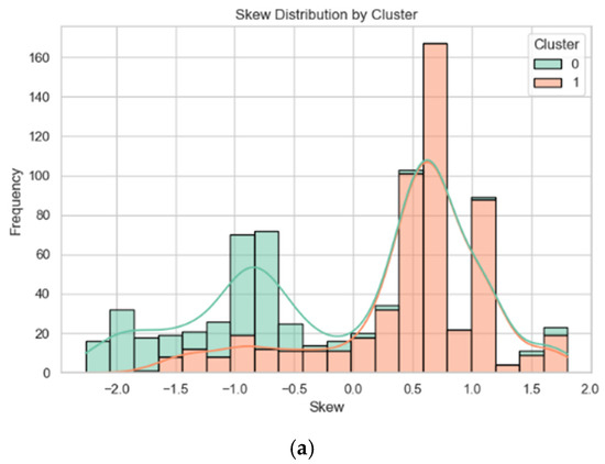 Figure 7a presents the frequency distribution of the skewness values of the two types of engine hot jets, and the KDE curve depicts the probability density distribution of the skewness values. The skewness distributions of type 0 and type 1 are significantly different. The skewness distribution of type 0 is relatively dispersed, covering a wide range from negative values to positive values, indicating that the spectral data of this type of hot jet has greater diversity in the asymmetry of the peak shape. It suggests that type 0 includes various different engine operating states or hot jet components, resulting in different asymmetric manifestations of spectral features. For example, in some operating conditions, there may be more impurities or incompletely burned substances in the wake flow, causing the peak to show different degrees of left or right bias. As shown in