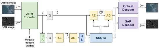 Overall scheme of joint SAR–optical compression and decompression. A joint encoder derives a single compressed representation of both the SAR and optical image, while disjoint decoders allow independent decoding of each modality. AE/AD: Arithmetic Encoding/Decoding; HA: HyperAnalysis network. HS: HyperSynthesis network; Q: quantization; SCCTX: Space-Channel ConTeXt model from [23].