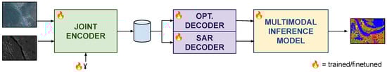 Figure 3 shows a diagram of the proposed joint compression model interfacing with a detection model, e.g., for land cover classification. All the building blocks of the detection and compression model can be finetuned with a rate-constrained task-specific objective. For example, in a typical segmentation problem, a Lagrangian loss accounting for rate and cross-entropy with respect to the pixel class labels would serve as the natural optimization target for finetuning. Let us denote as , , , the joint encoder, optical decoder, SAR decoder, and classifier models, respectively, and, as v, the ground truth classification labels. The end-to-end optimization process would then train the parameters of those models as follows: