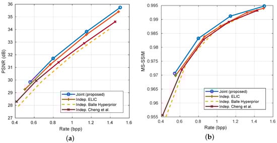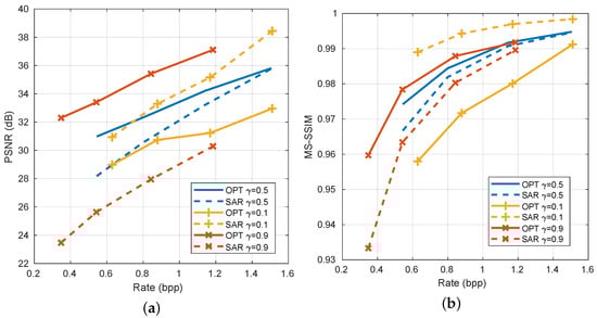 Quantitative results from the WHU-SAR-OPT test set for compression of SAR and optical images ((a) PSNR, (b) MS-SSIM quality metrics). Rates and quality metrics account for compression of both modalities [23,25,26].