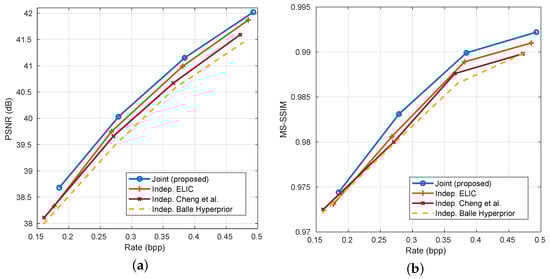 The main experiment on rate-distortion performance of the proposed joint model trains the model for approximately 100 epochs with a batch size of eight. A learning rate equal to is used and manually decayed to after 80 epochs. Four models with different rate-distortion operating points are trained, corresponding to Lagrange multiplier values in Equation (3). MSE is used as distortion metric for training.