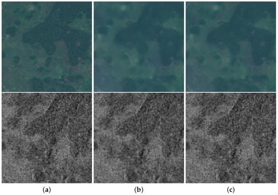 Qualitative results from the SEN12MS test set for compression of SAR and optical images. Top row (optical): ground truth (a), joint compression (b), independent compression with ELIC (c). Bottom row (SAR): ground truth (a), joint compression (b), independent compression with ELIC (c). Rate is approximately 0.17 bpp for all images.
