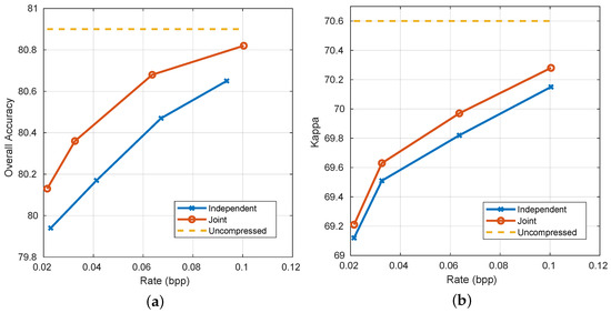 Rate-constrained land cover classification performance on the WHU-SAR-OPT dataset ((a) Overall Accuracy, (b) Kappa coefficient).