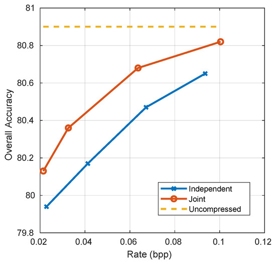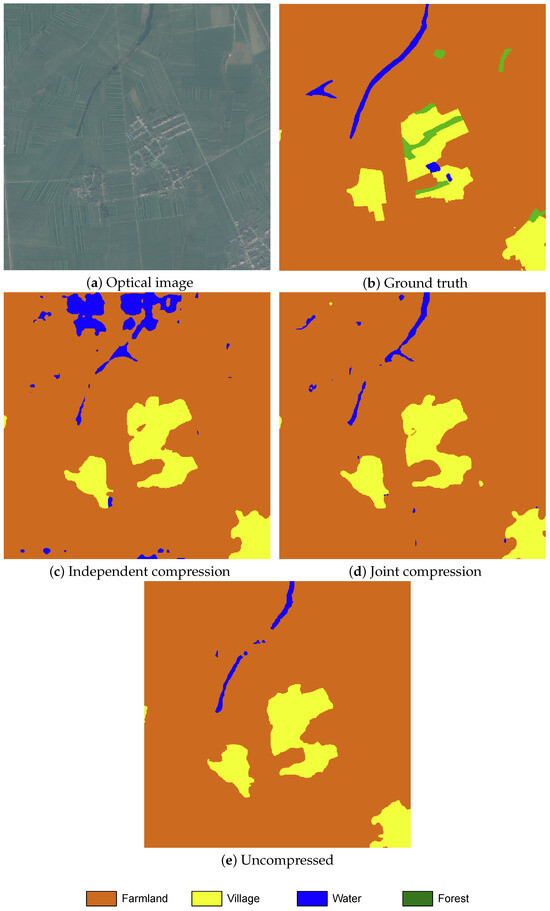 At the same time, the emergent coding-for–machines paradigm [10] seeks to develop data compression models that are not necessarily optimized for human consumption but rather preserve features that are relevant for the models solving downstream problems, such as image classification. The proposed development of a joint multimodal compressor becomes especially interesting when paired with downstream tasks and models that are designed to exploit multimodal information. These are becoming more and more prevalent in remote sensing [1,2,3,4,5] because it has been observed that integrating SAR and optical data can lead to improved accuracy in various detection tasks. Therefore, we present an end-to-end optimization of the proposed compression model together with a state-of-the-art joint SAR–optical deep model for land use segmentation [11]. The end-to-end optimization process allows the compressor to only preserve joint features that are useful to the downstream model for the land segmentation task, as well as to directly optimize the tradeoff in quality between the two modalities to maximize segmentation performance.