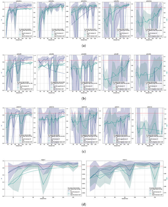 - RT-DETR with model descriptions represents a hybrid approach combining CNN backbones with Transformer decoders, utilizing deformable attention for adaptive feature sampling and parallel prediction heads for real-time performance. Unlike pure CNN-based YOLO variants, RT-DETR’s Transformer components enable the modeling of global relationships between objects. We selected it over pure Transformer models (like DETR) due to its real-time capabilities and proven performance on agricultural datasets [36]. Its inclusion allows direct comparison between CNN-only and hybrid approaches for minimum dataset requirements.