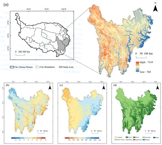 Study area: (a) location of the study area and DEM data; (b) distribution of mean annual temperature; (c) distribution of total annual precipitation; (d) land use types.