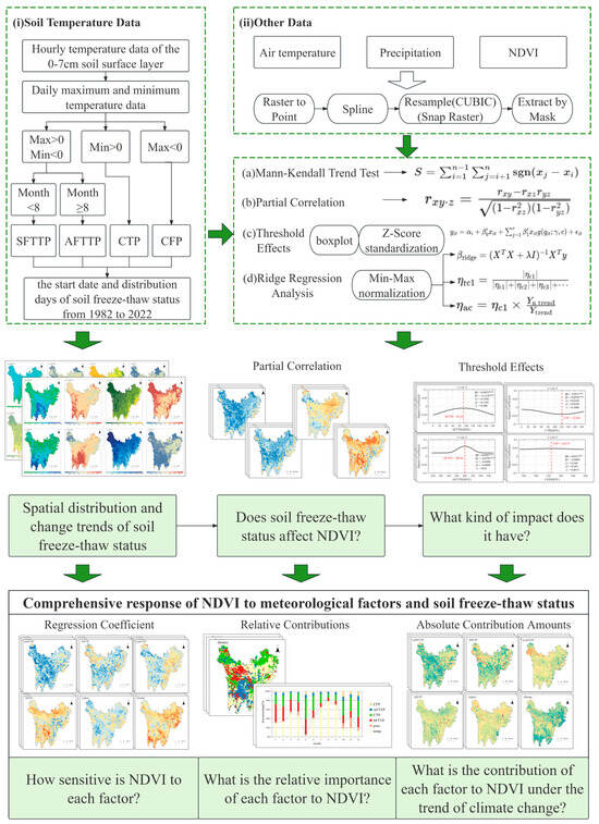 In the equation, is the standardized NDVI, represents the standardized soil freeze–thaw and meteorological factor data, and is the regression coefficient. Finally, the sensitivity, relative contribution, and absolute contribution of each factor to NDVI are calculated using the ridge regression coefficients and the trends of the standardized climate and soil freeze–thaw factors.