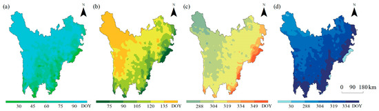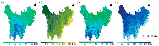 The spatial distribution of the onset dates of the SFTTP (a), CTP (b), AFTTP (c), and CFP (d) in the eastern Tibetan Plateau.