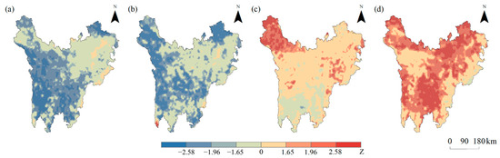 The temporal trends of the number of days of the SFTTP (a), CTP (b), AFTTP (c), and CFP (d) in the eastern Tibetan Plateau (areas that pass the 5% significance test are indicated by dots).