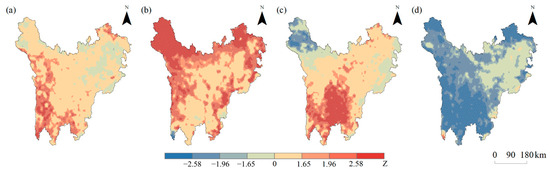 We used ridge regression analysis to quantify the contribution coefficients of these variables to NDVI. As shown in Figure 11 and Figure 12, the spatial distribution of the regression coefficients is presented. As shown in Figure 13, the percentages of positive and negative areas and the averages within the study area are presented.