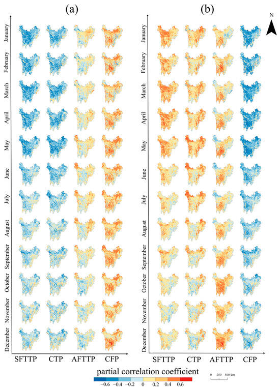 The distribution of partial correlation coefficients between the onset dates (a) and duration (b) of soil freeze–thaw status and NDVI from January to December.