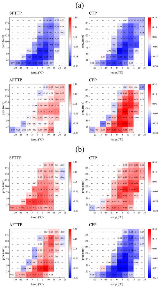 To further analyze the spatial differences in the response of in different months to temperature, precipitation, and soil freeze–thaw status, the partial correlation coefficients were calculated for each grid point along the spatial distribution of monthly average temperature and monthly total precipitation. The mean partial correlation coefficients were then computed for each interval of 5 °C in temperature and 25 mm in precipitation. Intervals with fewer than 50 valid grid points were not calculated due to insufficient data.