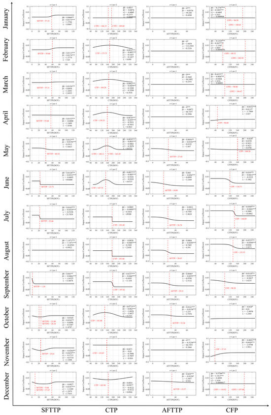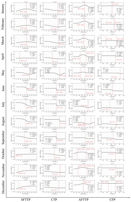 Regarding CTP, when the duration is short (less than 253 days), the impact coefficients for February to April were positive, around 0.04, and the promoting effect strengthened as the duration increases, reaching maximum values at durations of 176 days, 169 days, and 159 days, before slightly decreasing. For May and June, the impact coefficients also first rise and then fall, with thresholds at 156 days and 148 days. There are also very significant breakpoints in July to September. Before the thresholds, the impact coefficients are −0.0005, −0.0038, and 0.0157, respectively, and they rapidly weaken to −0.0414, −0.0525, and −0.029 when the durations reach 194, 193, and 197 days. The impact coefficient for October was significantly positive and showed a typical “inverted U-shape,” with the maximum impact coefficient of 0.0364 at a duration of 177 days. The impact coefficients for October to December remained positive, but this effect was very weak.