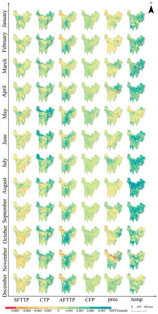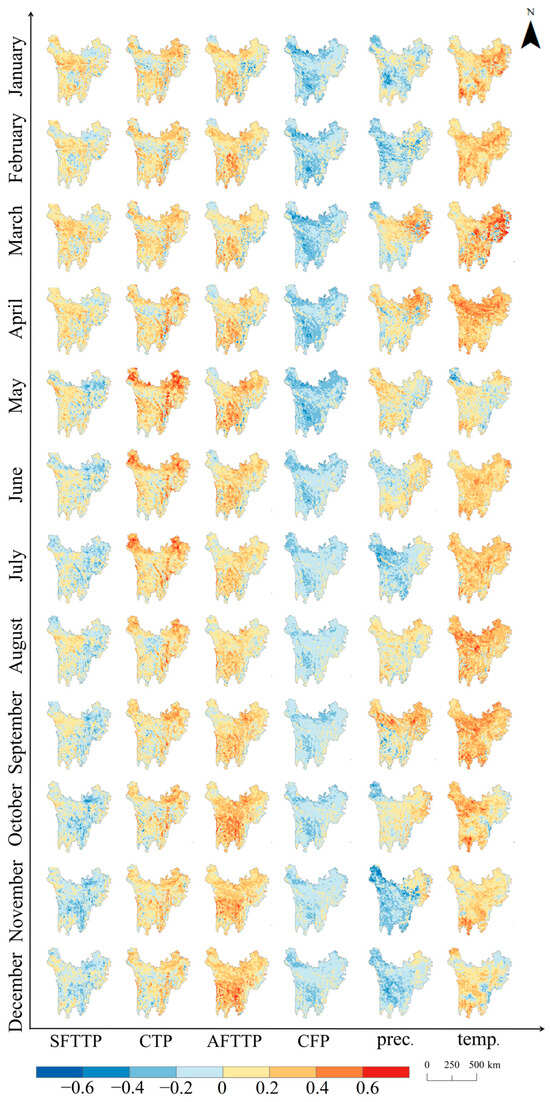 The distribution of the sensitivity of NDVI to the duration of soil freeze–thaw status and meteorological factors over 12 months (from left to right in the figure: SFTTP, CTP, AFTTP, CFP, precipitation, temperature; from top to bottom: January to December).