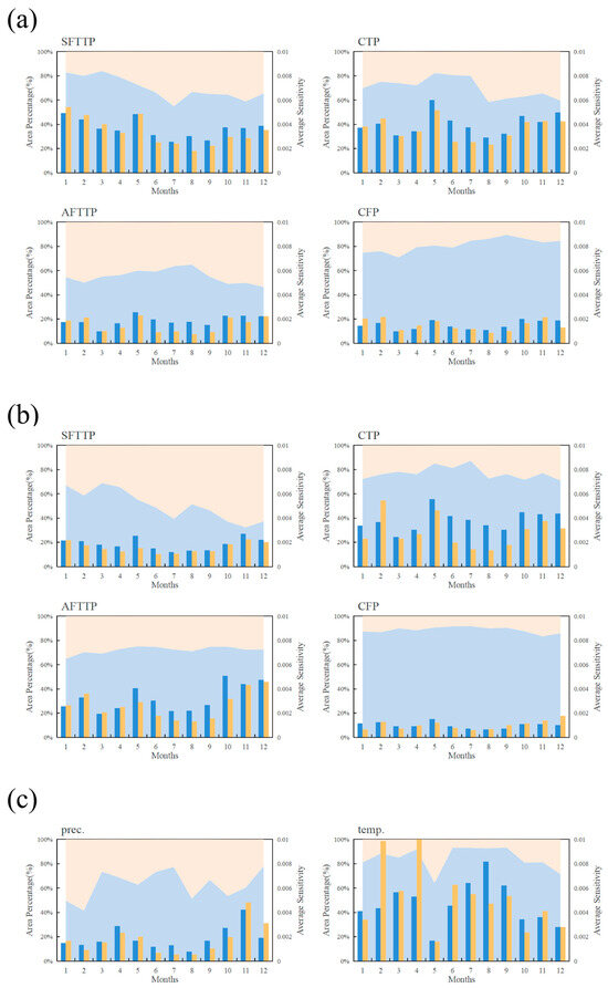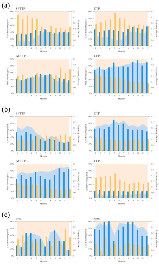 As shown in Figure 7a, the onset date of the SFTTP is significantly negatively correlated with NDVI from January to December, with a stronger negative effect from January to June, covering over 90% of the area. This negative effect weakens from July to December. The onset date of the CTP is also significantly negatively correlated with NDVI, especially in June, and the negative effect is stronger in the early growing season. The AFTTP showed significant spatial and temporal variability in its correlation with NDVI, with a slightly stronger positive in the early growing season and a stronger negative effect in the late growing season. The positive correlation is mainly in the northwest, specifically in Ruoergai County, while the negative correlation is scattered in the central Hengduan Mountains. The CFP onset date is significantly positively correlated with NDVI, with over 80% of the area showing a stable positive correlation over the 12 months.