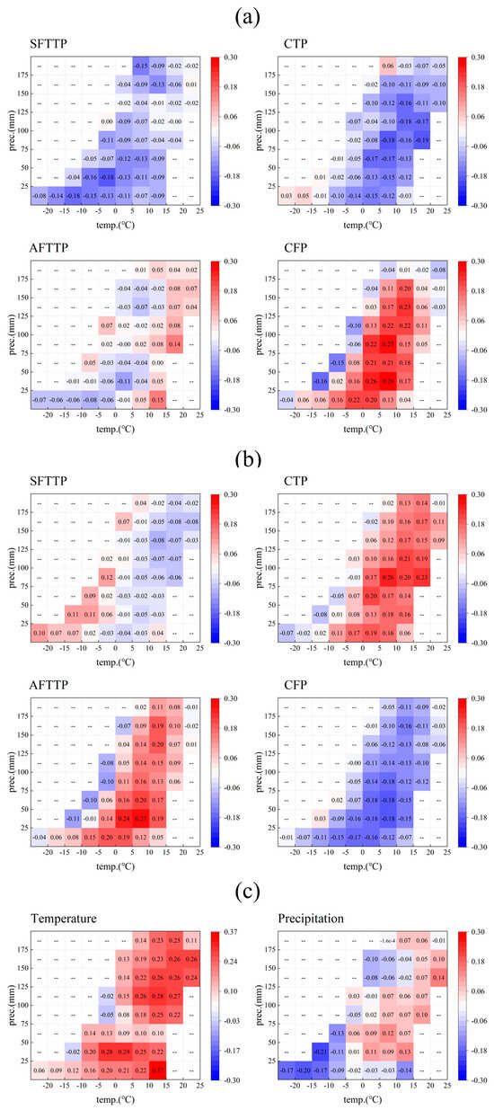 As shown in Figure 8, the onset date of the SFTTP and the CTP exhibited a clear negative correlation with NDVI, especially in cold and dry areas around 0 °C with low precipitation. The AFTTP onset date has a negative correlation with NDVI in very cold and dry areas (below −10 °C, below 50 mm), with a maximum correlation at 15–20 °C and 75–100 mm. This correlation decreases to near 0 as temperature and precipitation increase further. The CFP onset date has a strong correlation with NDVI when temperature is 0–15 °C and precipitation is 25–150 mm.