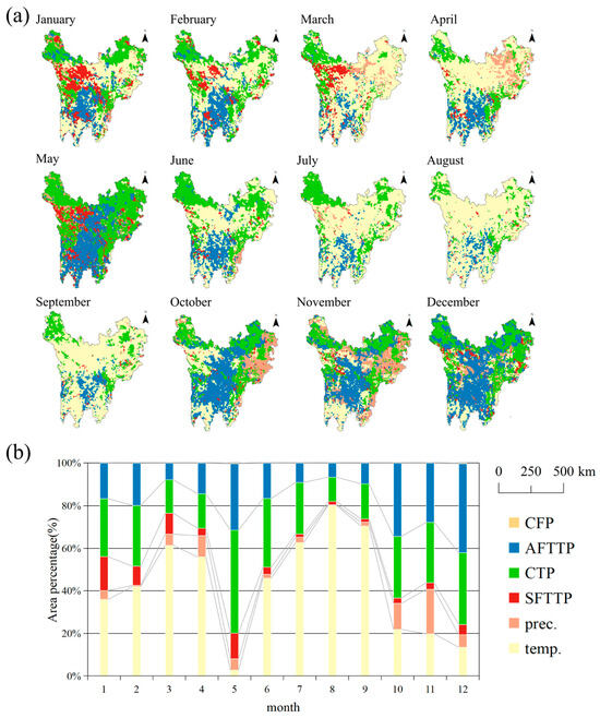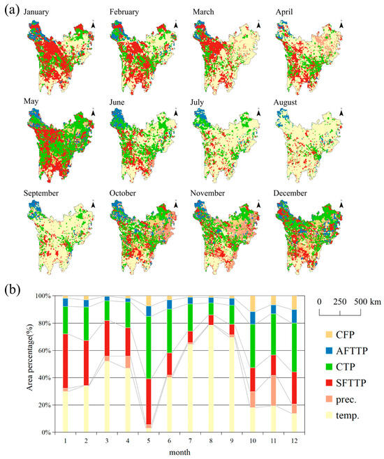 As shown in Figure 7b, the duration of the SFTTP is significantly positively correlated with NDVI over 12 months, peaking at 93% in the early growing season and then weakening. Spatially, this correlation is stronger in the west and north. The duration of the CTP shows a similar trend, with a strong positive correlation in the early growing season that weakens over time, and spatially, it is mainly positive in the northwest and east but negative in the south. The AFTTP duration has both positive and negative effects on NDVI in the early growing season, showing significant spatial heterogeneity. From January to September, significant positive correlation areas fluctuate between 60% and 70%, rising to 90% by December. Spatially, Ruoergai County in the northwest showed a significant negative correlation early on, which weakens later, while the Hengduan Mountains in the south showed a strong positive correlation. The CFP duration is significantly negatively correlated with NDVI, weakening in the late growing season but still covering over 80% of the area. Spatially, except for the Qionglai Mountains in the east, which showed a certain degree of positive correlation in the late growing season, other areas showed a significant negative correlation.