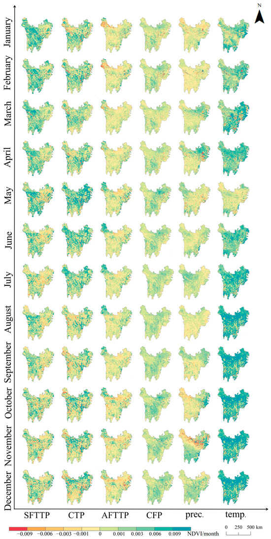 Regarding the onset date of soil freeze–thaw status, the SFTTP has a strong negative impact on NDVI from January to May, accounting for 80% and widely distributed in the southwestern part of the study area. The CTP has a strong negative impact on NDVI from March to July, accounting for more than 70%, with a relatively scattered distribution showing a certain zonal distribution pattern. The AFTTP has a strong spatial heterogeneity in its impact on NDVI, with a slightly stronger negative effect than positive, accounting for about 55% from January to September, mainly distributed in the central longitudinal area; from October to December, it accounts for about 70%, with an absolute value reaching above 0.18. The CFP has a strong positive effect on more than 60% of the area throughout the year, with an average positive effect always above 0.2.