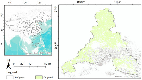 The study area encompasses Jinan, located in Shandong Province, northern China; it represents an agro-ecological microcosm, where complex farmland transitions unfold. The region lies between approximately 36.67°N to 37.5°N latitude and 116.67°E to 117.5°E longitude, featuring a mix of agricultural land and other land cover types (Figure 2). Its climatic duality—spanning semi-arid northern plains to humid southern foothills—creates a natural laboratory for modeling divergent abandonment pathways, from drought-driven soil exposure to weed encroachment. The cropland area covers more than half of the study area. The high proportion of cropland highlights the area’s significance in agricultural activities and its potential vulnerability to land use changes. This convergence of climatic gradients, geomorphic contrasts, and socioeconomic tensions reflects the representativeness of cropland transition, positioning Jinan as a critical observatory for the development of transferable abandonment frameworks.