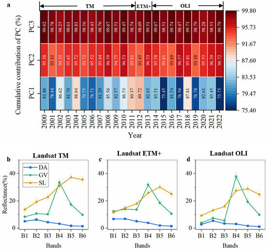 Figure 3. Spectral curves of specific endmembers for Landsat. (a) Cumulative contributions of the first three principal components. (bd) Mean and standard deviation of the spectral curves for the three surface endmembers, namely SL, GV, and DA, which represent green vegetation, soil, and dark material, for three Landsat sensors, TM (b), ETM+ (c), and OLI (d). B1–B6 are the blue, green, red, near-infrared, short-wave infrared 1, and short-wave infrared 2 bands.