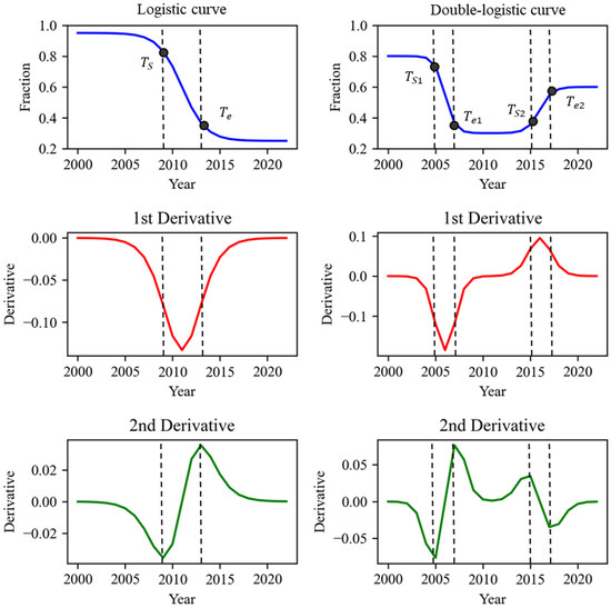 For the double-logistic curve, which consists of two logistic curves, the process of parameter extraction follows a similar approach to that of the single-logistic curve. Four change points ( T s 1 , T e 1 , T s 2 , and T e 2 ) are derived from localized extremes of the second derivative (Figure 4). Additionally, the change magnitude ( M s e ) is calculated through the fraction values before and after the change point for each logistic, and the duration of change is defined as the difference between the ending change point timing for the first logistic and the starting change point timing for the second logistic.